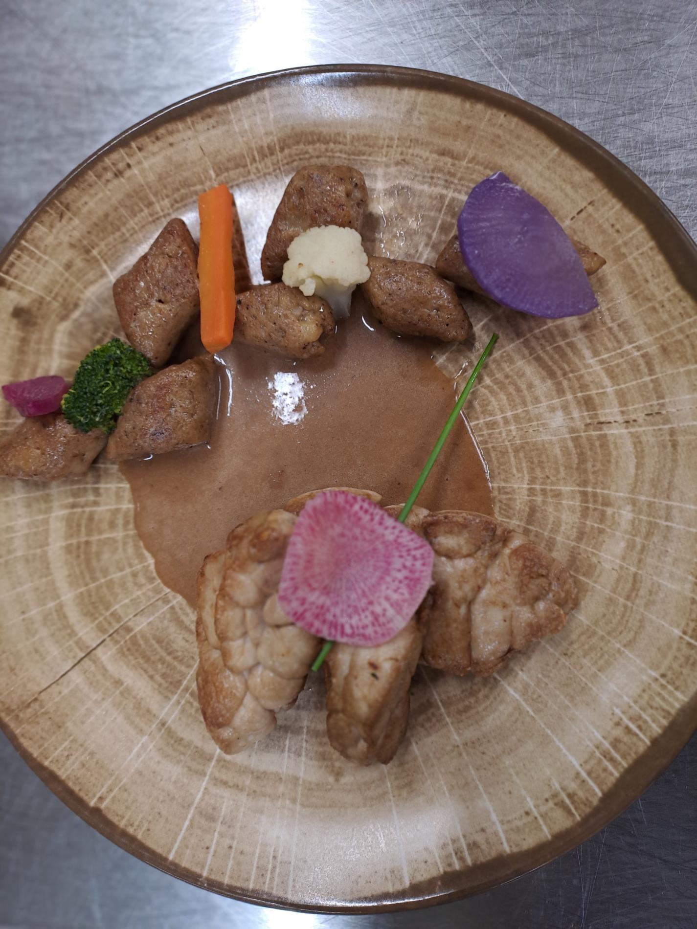 La pièce de bœuf Charolaise poêlée, étuvé d’épinard et légumes rôtis, jus au poivre blanc