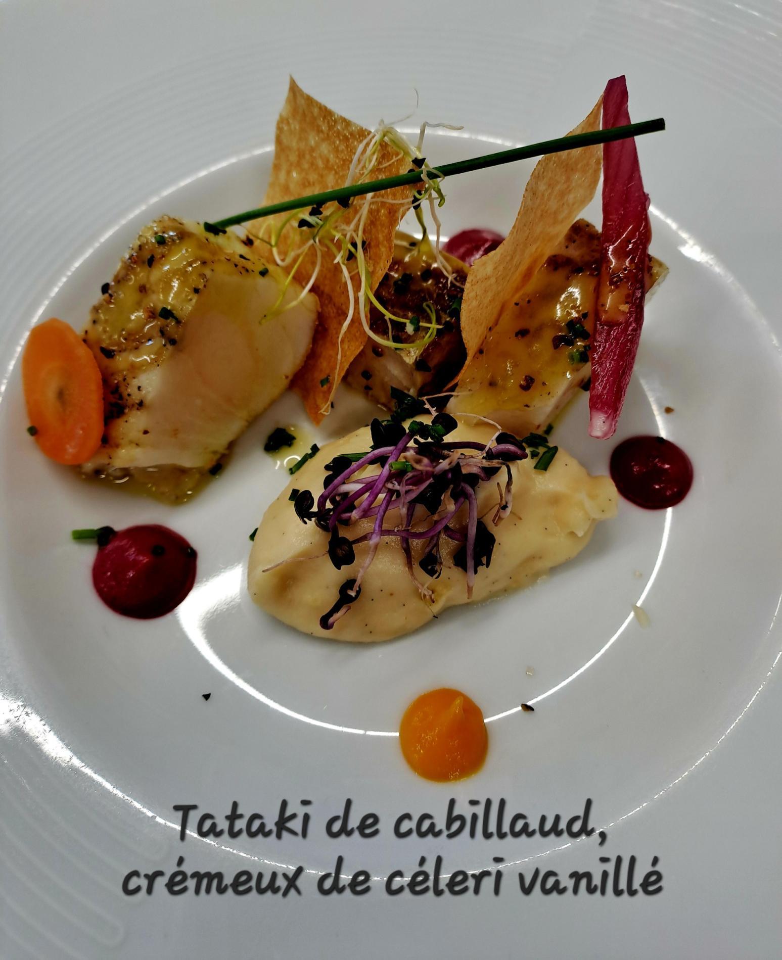 herbes, spaghetti de légumes du moment, vierge à la Cébette ou Le carpaccio de Saint Jacques, huile pimentée et